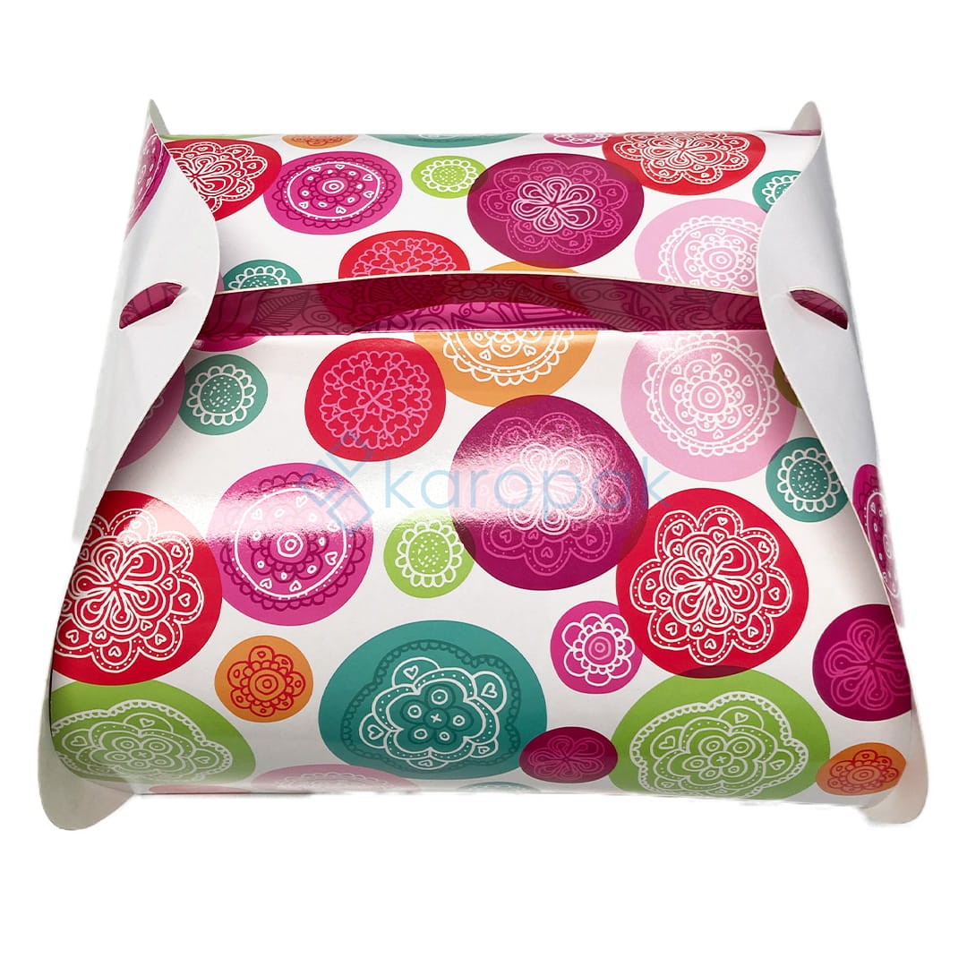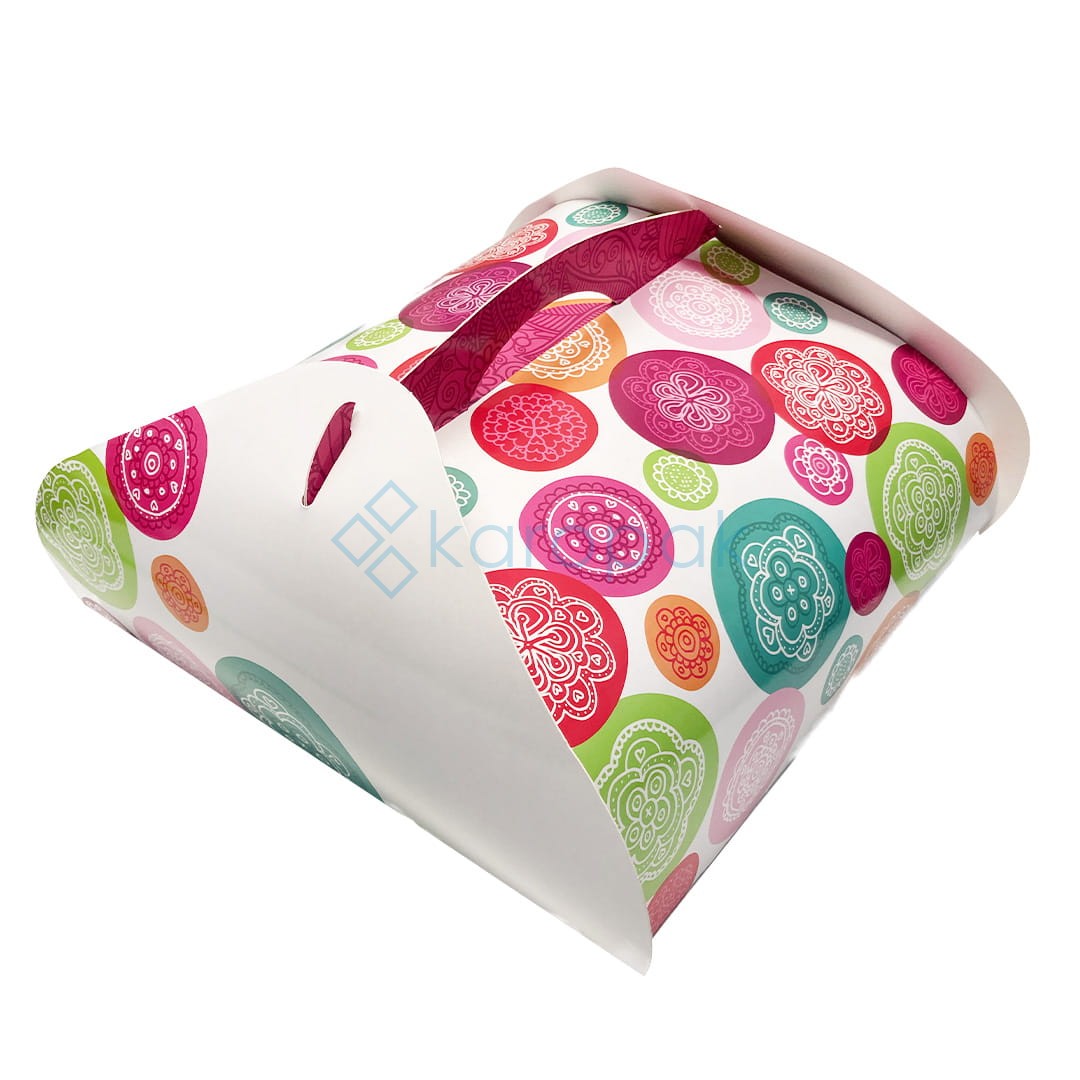 Kolorowe pudełko składane na tort o wymiarach 36x36x15 cm to idealne rozwiązanie do bezpiecznego i estetycznego pakowania tortów i dużych wypieków. Wykonane z trwałego, wysokiej jakości kartonu, zapewnia solidną ochronę podczas transportu i przechowywania.